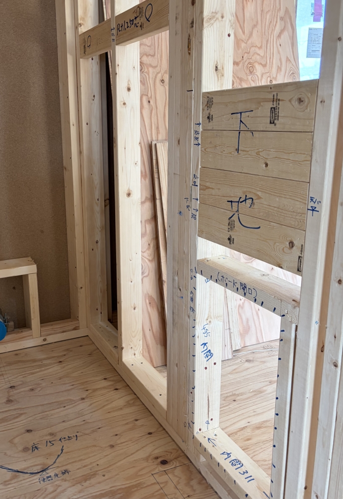 そんな中おやっ?と目を引かれたのがこちらの写真です。どうやらうちでいつもお願いしている水道屋さんがマーキングしていったようです。こういったものは今この時じゃなければわからない印。なんだかお宝発見の様で勝手にワクワクしてしまいました。場所はトイレ(室)。ニッチだったり便座の位置だったりタオルリング位置の候補だったりの印があります。