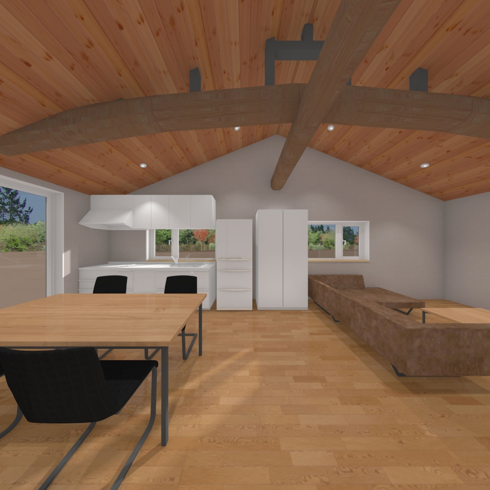 内装がこんな感じでいかがでしょう?リビングだけは古民家風にしてみました。