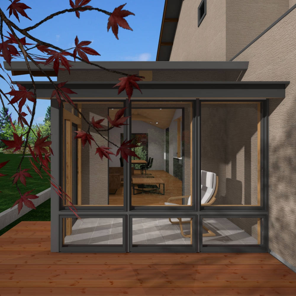 私は実のところサンルームの使い方がイメージできなかったので、リノベ案にはデッキとテラス屋根を提案してました。ですが「私がくつろぎたいだけなのでテラスよりサンルームがいいです」ということで急遽リノベ案にもサンルームをつけた提案を作りました。