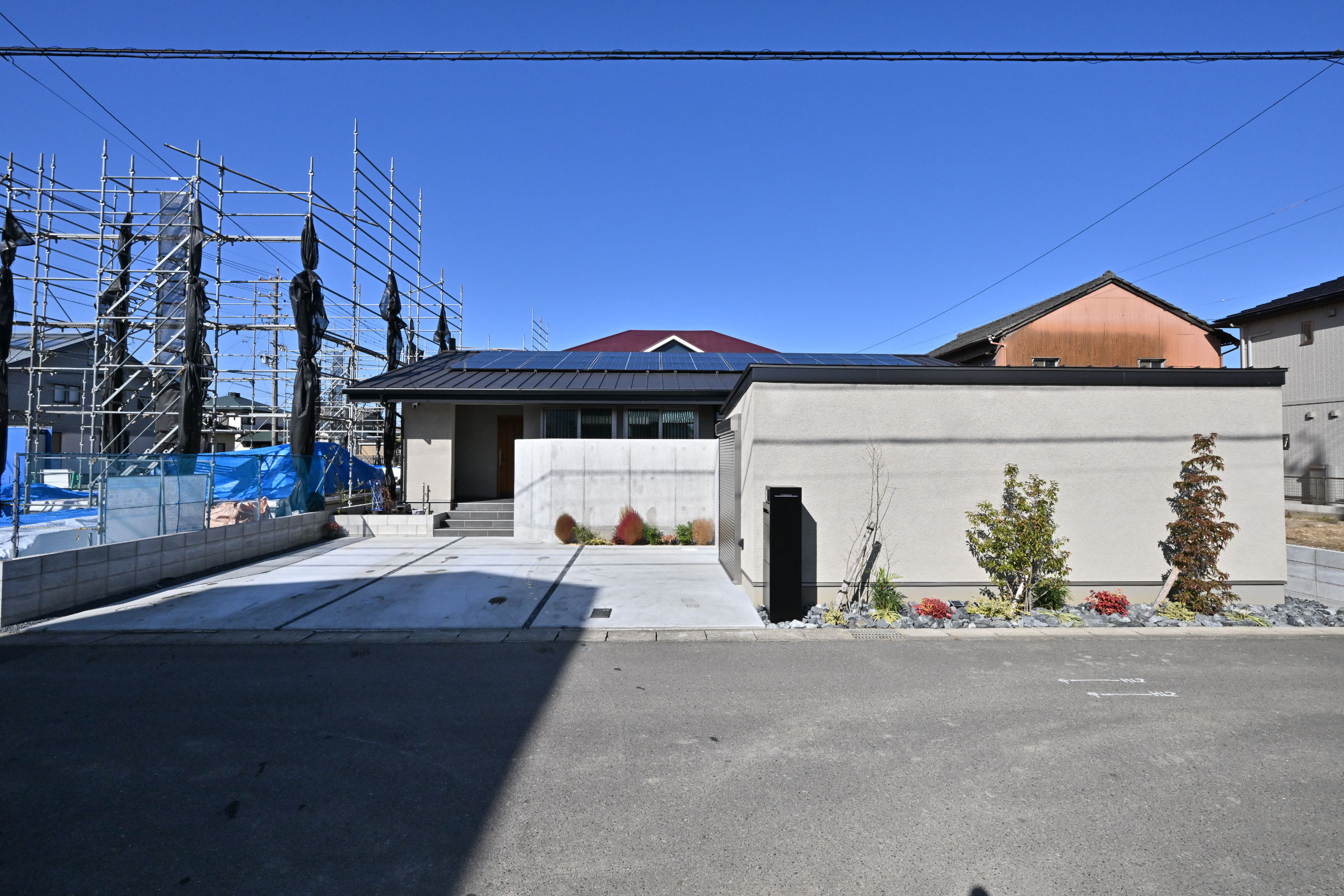 このお住まいは、市街地に近い住宅街に位置しています。前面道路は決して広くはありませんが、それなりの交通量がある「南向き」の敷地です。通常、こうした条件では道路側に駐車スペースを配置し、その奥に建物を構えるレイアウトが一般的です。