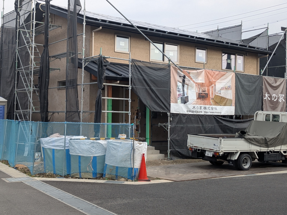 さて、休み明けに犬山の現場を見てきました。上の写真は外壁が仕上がったところです。採用した外壁は白洲そとん壁という塗り壁で弊社ではよく使う素材です。
