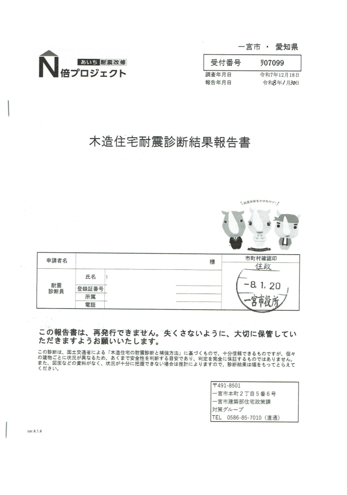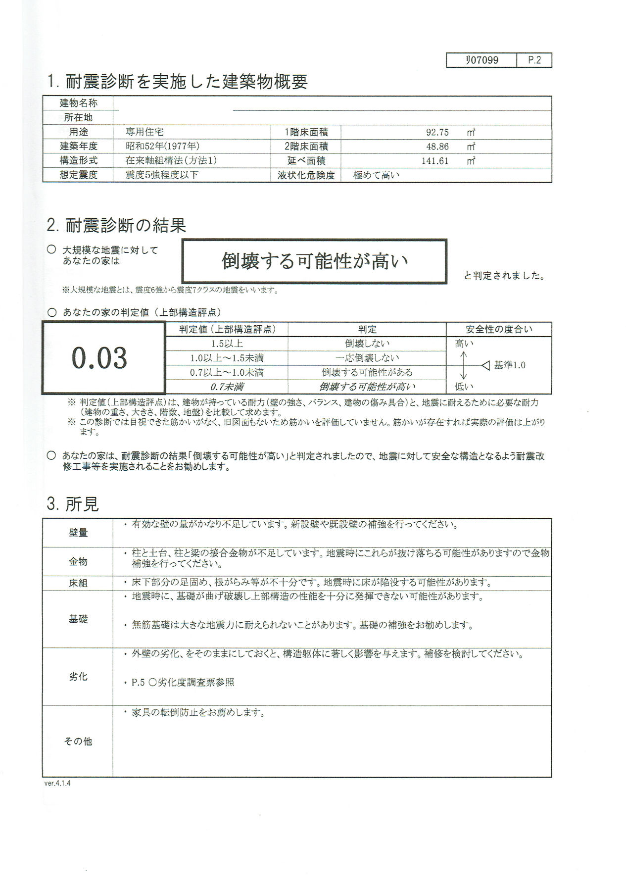 1月30日に市の耐震診断員より耐震診断の結果報告がありました。結果報告書によるとお客様の家の判定値は0.03になりました。報告書では、大きな地震に対して判定値が1.5以上なら「倒壊しない」に対し、0.7未満なら「倒壊する可能性が高い」と書かれてます。この家は0.03なのでさらにひと桁低い値になってしまいました。