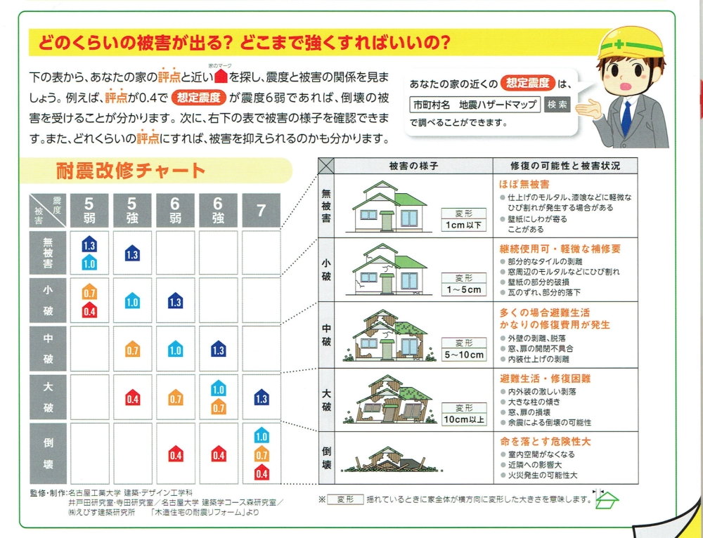 耐震補強工事をすれば「大地震が来ても家は壊れない」というのが一般の人の認識だと思います。ところが実際は違うのです。「大地震が来たら家は壊れるけど中の人は生存できる程度の強さになる」というのが正解です。上の資料は耐震診断書と一緒にもらった減震協議会のチラシの一部です。ここに評点(判定値のこと)と震度との関係が示されてます。阪神大震災、東日本大震災、熊本地震ともに最大震度は7でした。耐震補強をして1.0という評点にできたとしても、震度7の地震で家は壊れてしまいます。
