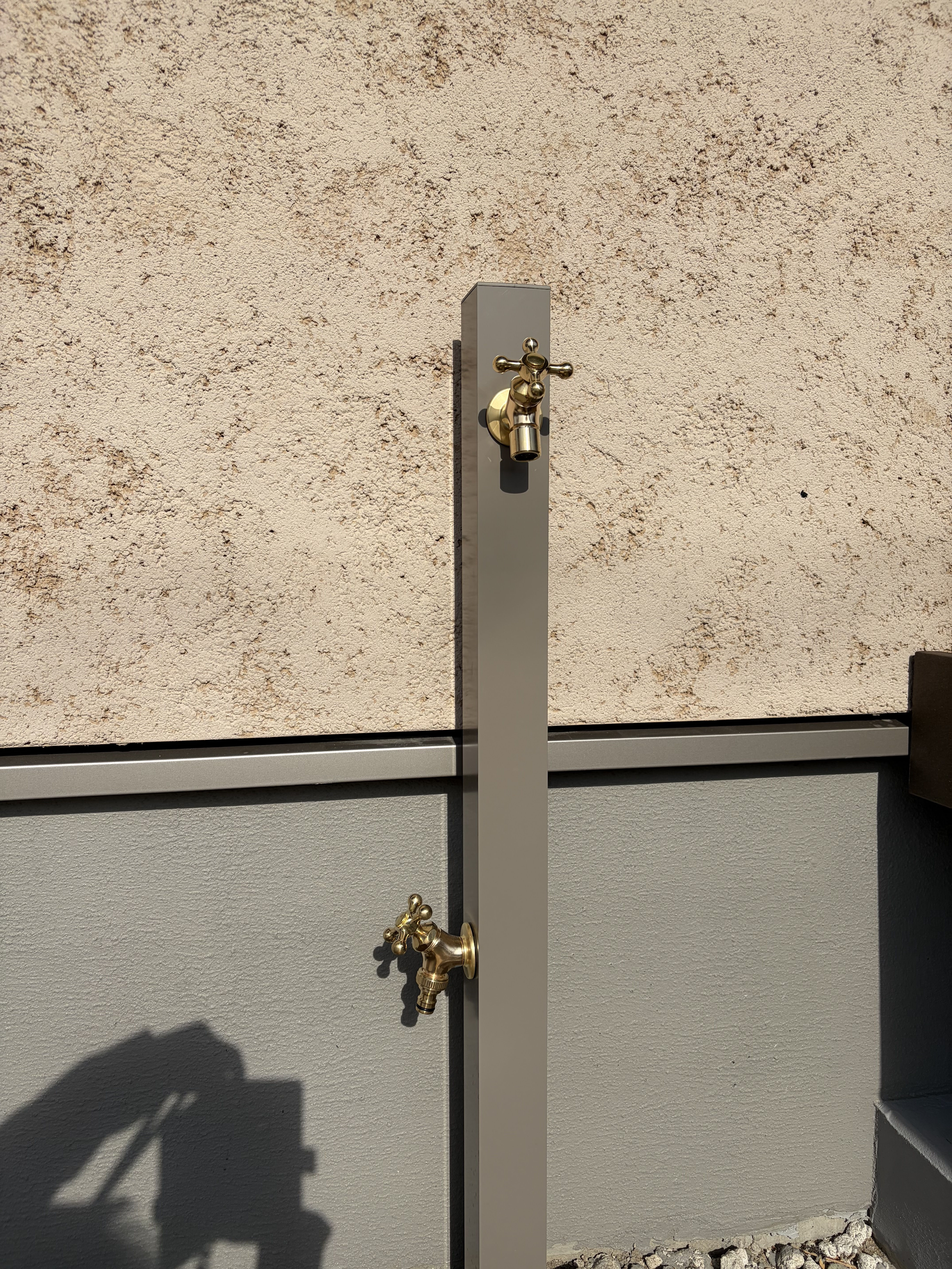玄関まわりにはアクセントとして金色の外水栓を採用。さりげないながらも印象に残る遊び心がポイントです。