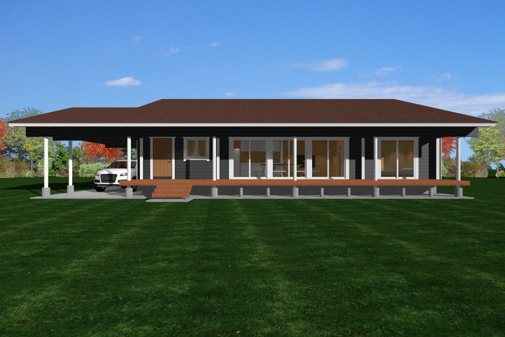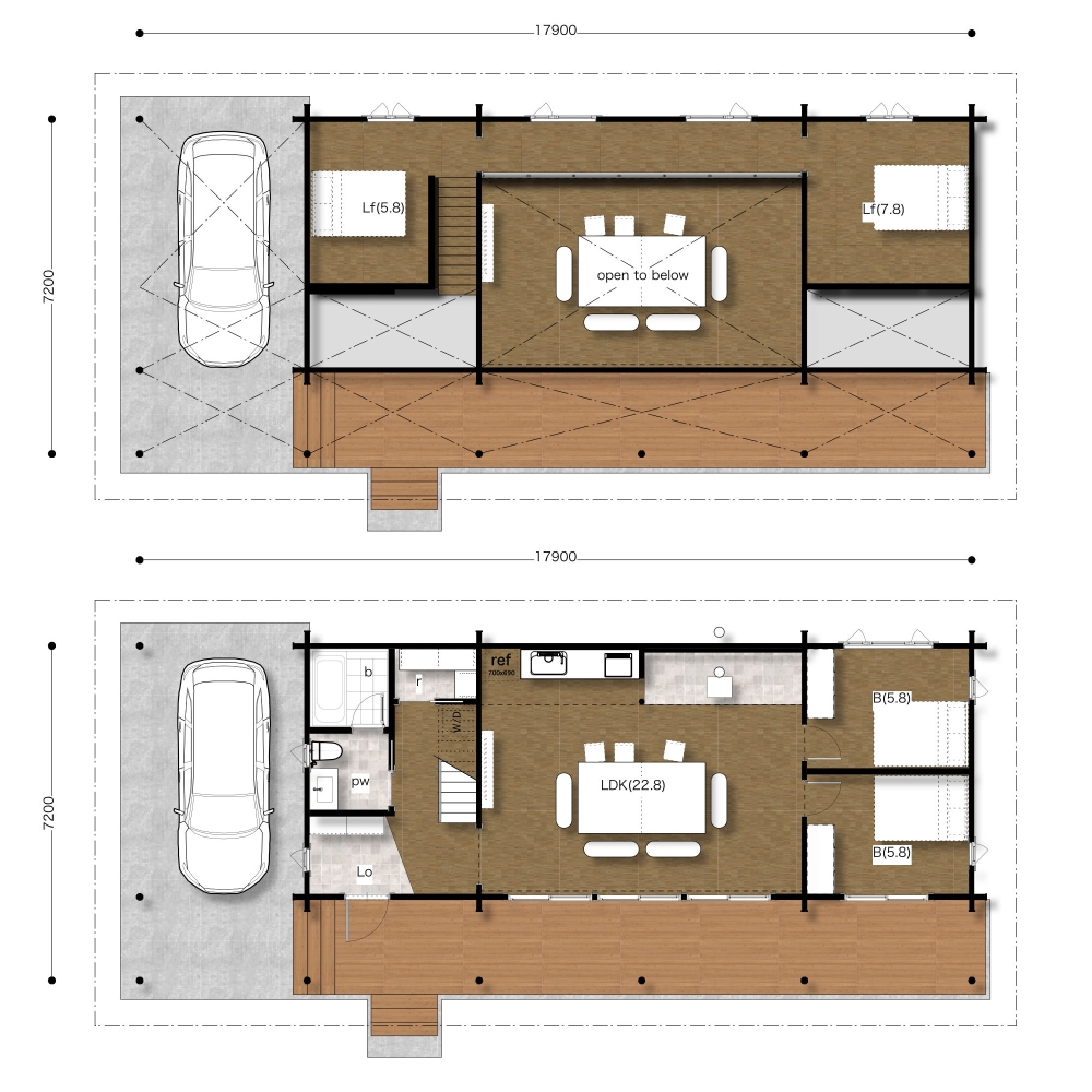 ログハウスを検討されている方のために提案プランを作りました。このログハウスは郊外の住宅地に建てるセカンドハウスです。リビングの中央に4メートル x 7メートルのスペースを確保し、公式サイズの卓球台を置きました。卓球台は広ーいダイニングテーブルとしても利用可能です。1階に2つの寝室を、2階の2つのロフトを配置し、家族や友人達を泊まれるようにしました。
