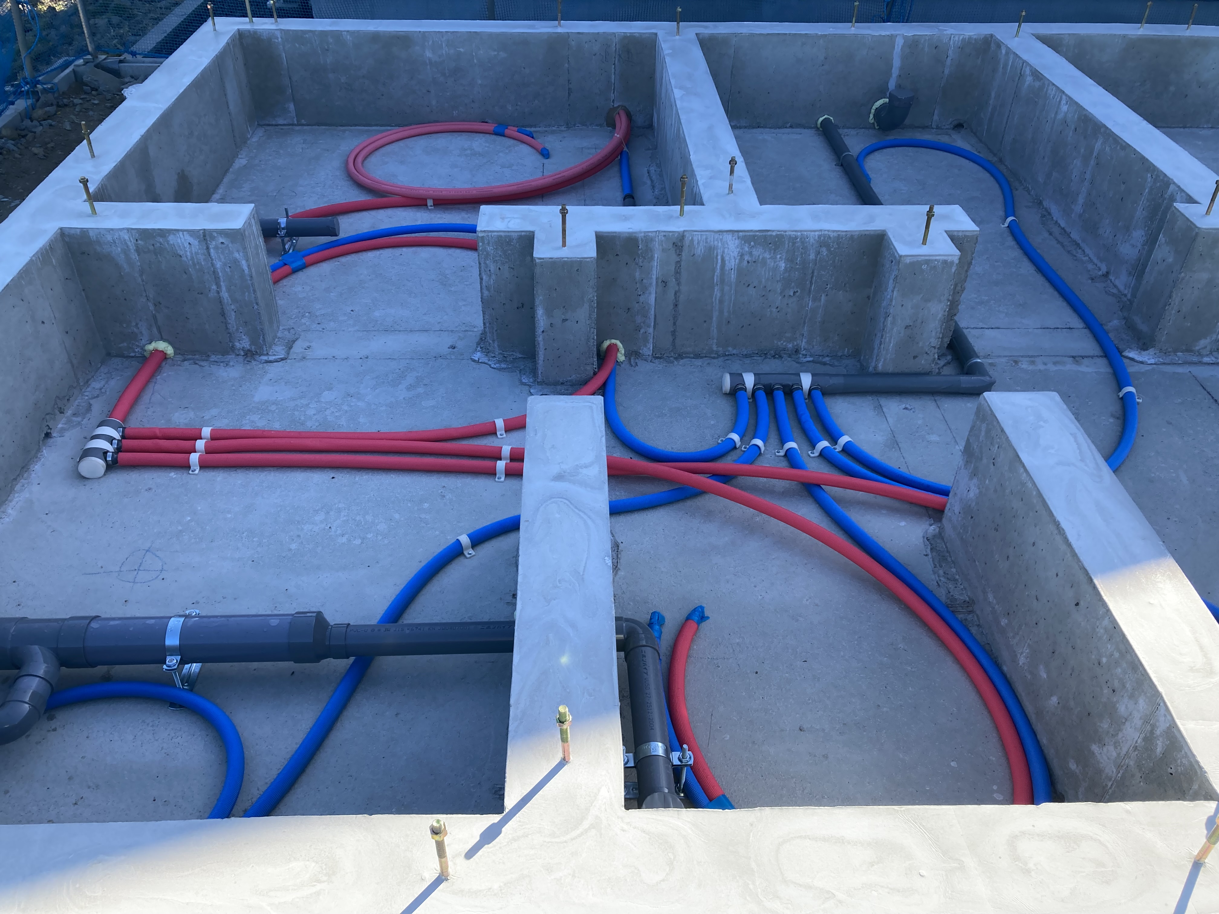 今回のような通常のベタ基礎の場合は前もってスリーブを基礎に入れておいて、その後配管を接続するので比較的容易です。