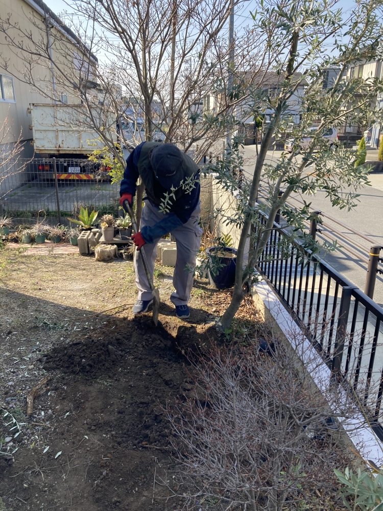 以前建てたお客様の実家のオリーブの木を植え替えました。